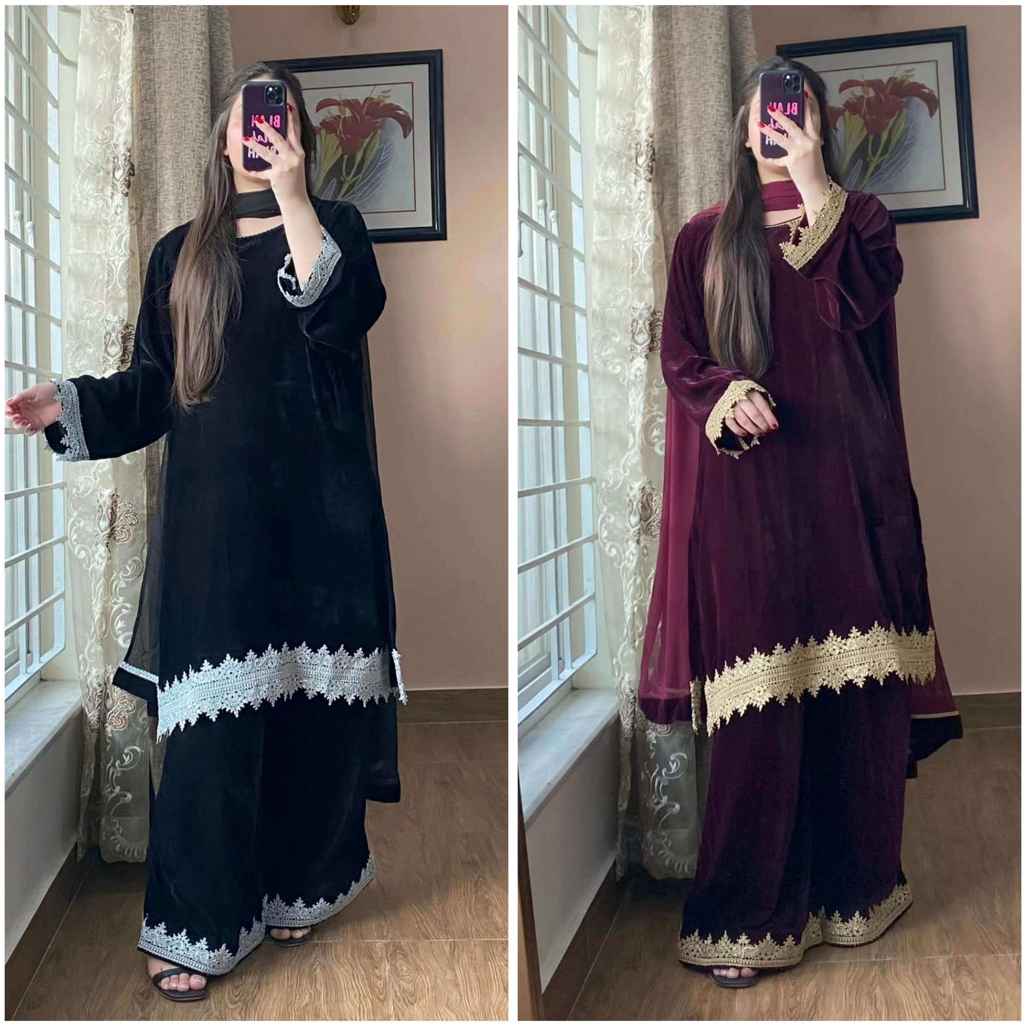 *FOR THIS WINTER SEASON IN VELVET DESIGNER WEAR KURTA PLAZZO PAIR WITH EMBROIDERY WORK❤️*