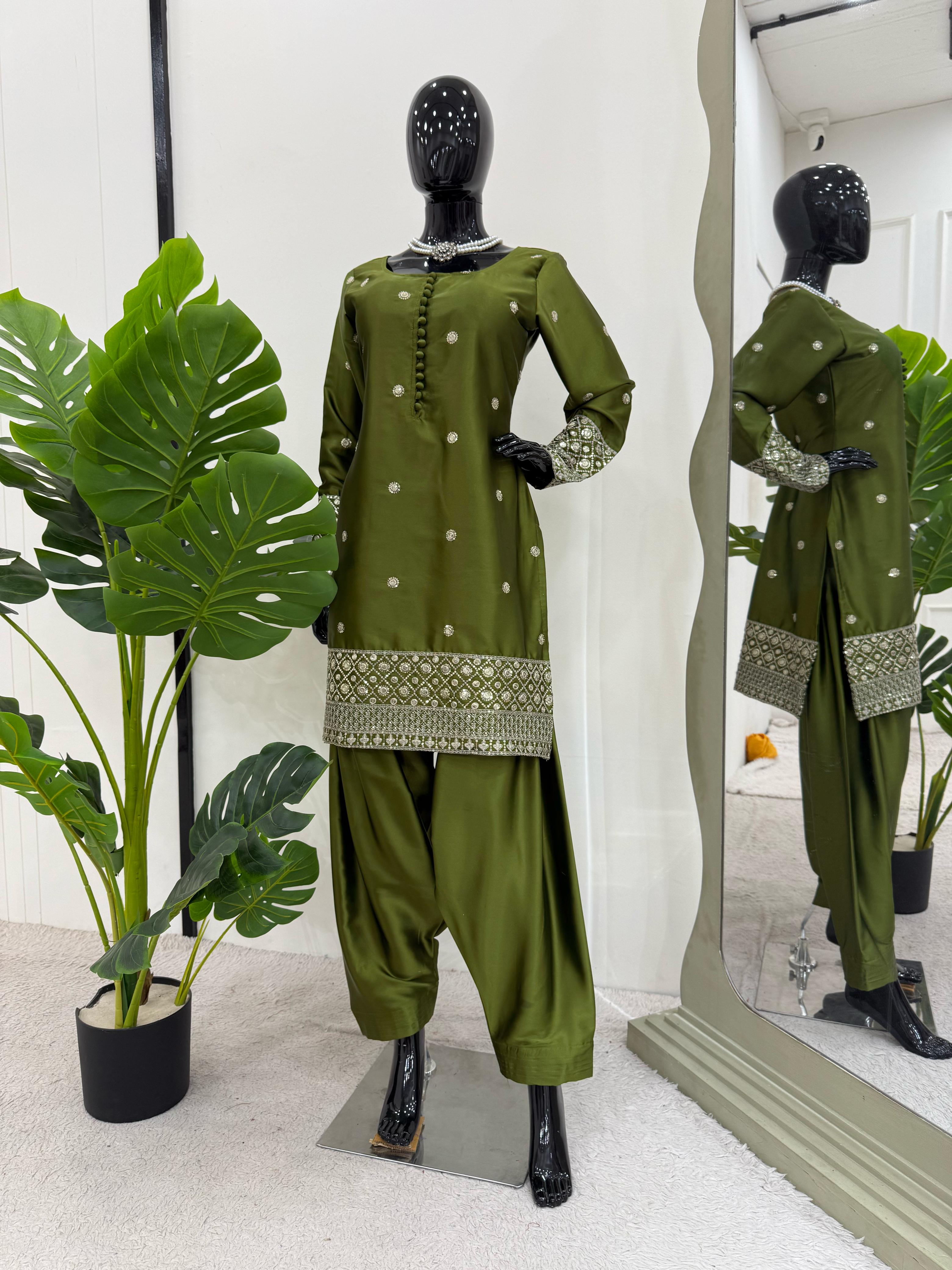Looking for this same colour beautiful Designer Suit on Japan Satin Silk febric with Inner and Sequnce work and Dhoti on also Japan Satin Silk Febric.